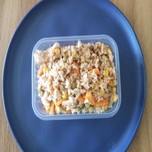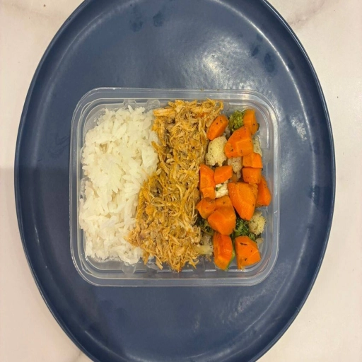 Combinação perfeita! Arroz branco fofo, frango desfiado suculento e legumes frescos. Uma refeição completa e delicio... Ver completo