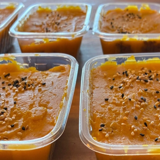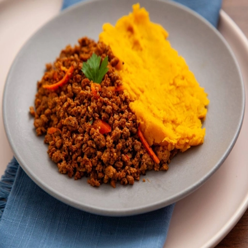 150 g de carne de patinho moído e purê de batata doce com uma pitada de gergelim