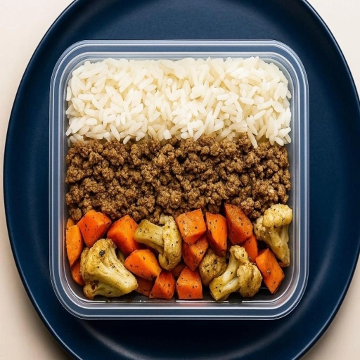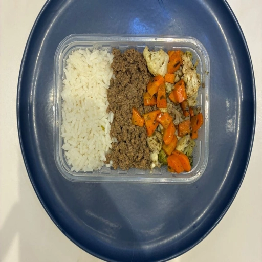 Arroz Branco , Carne de Patinho Moido e Legumes Cozidos 350g